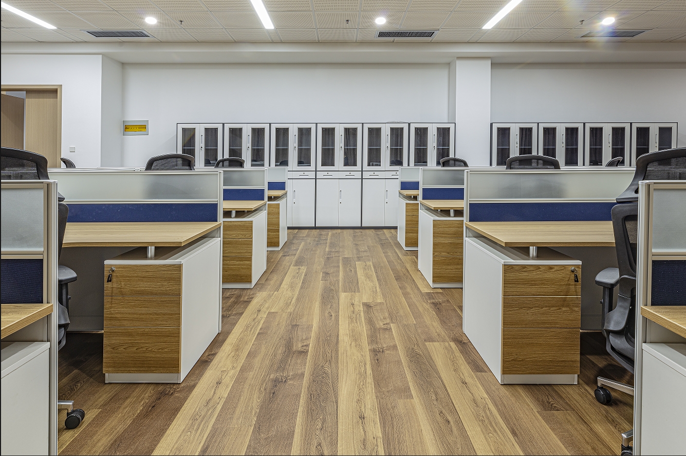 辦公區(qū)配置國(guó)景屏風(fēng)辦公桌、人體工學(xué)椅與多功能收納柜的模塊組合,滿足從日常辦公到協(xié)作的模式切換。